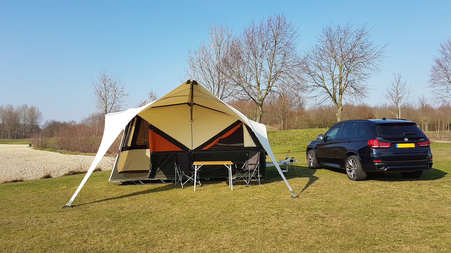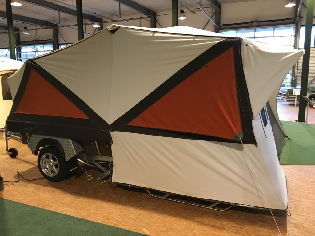Dieses Anhängerzelt ist ideal für zwei Personen und verfügt über einen Ausgang am Fußende des Bettes, damit Ihr Partner schlafen kann. Außerdem bietet es die Möglichkeit, Ihre E-Bikes zu transportieren.